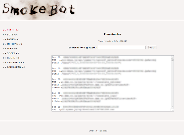 2012-04-28 - Panel Inside Smoke Bot - Botnet Control Panel Stats<edit1 20/10/12>Stats panel with more features in the menu</edit1>BotsTasksOptionsCmd ShellForm Grab